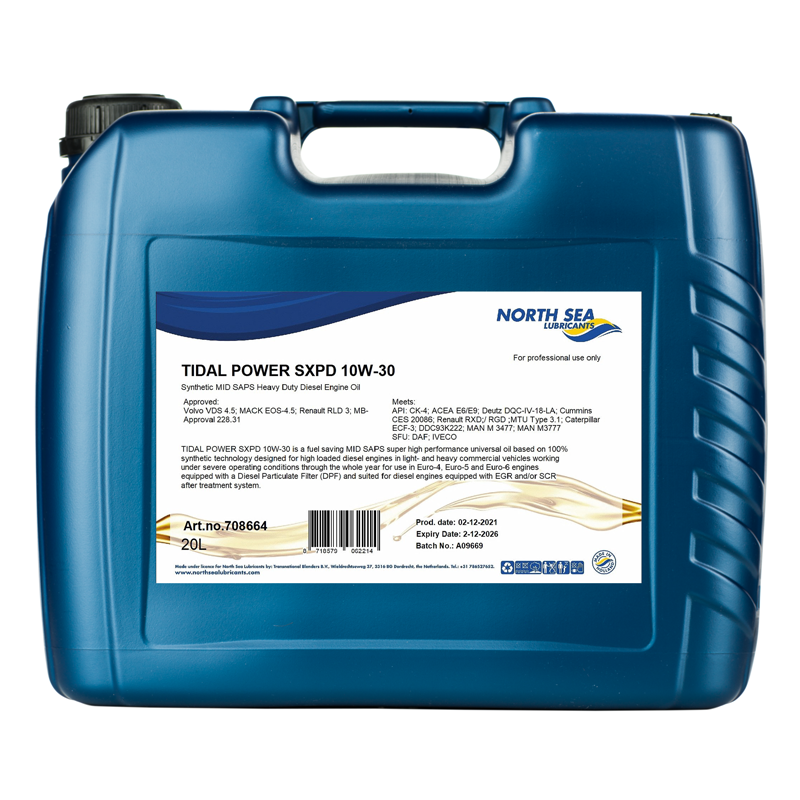 TIDAL POWER SXPD 10W-30 – паливозберігаюча надвисокоефективна універсальна олива MID SAPS на основі 100% синтетичної технології, призначена для високонавантажених дизельних двигунів легких та важких комерційних автомобілів, що працюють у важких умовах експлуатації протягом усього року , для використання в Євро-4, Євро-5 та Євро-6, оснащені сажевим фільтром (DPF) та придатними для дизельних двигунів, оснащених системою очищення вихлопних газів EGR та/або SCR.